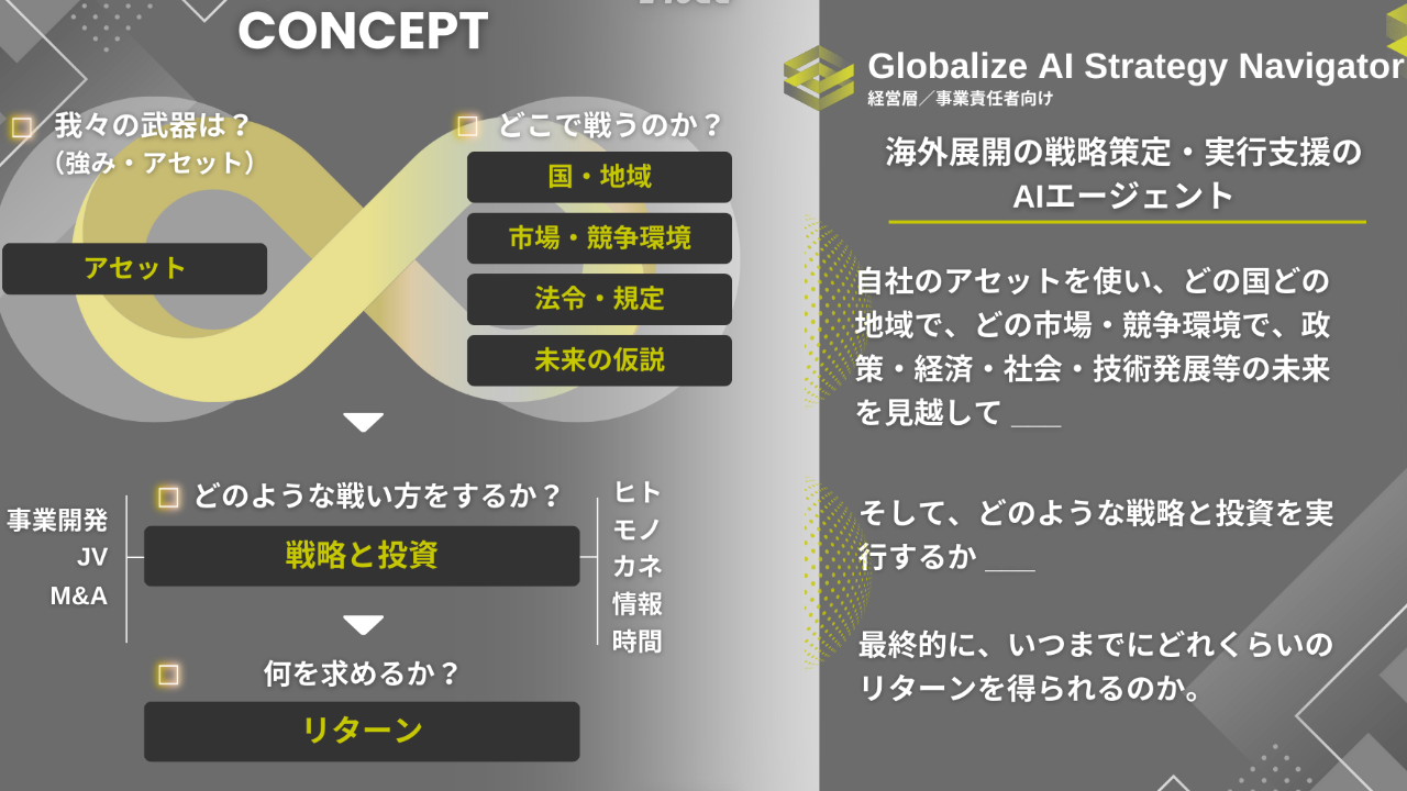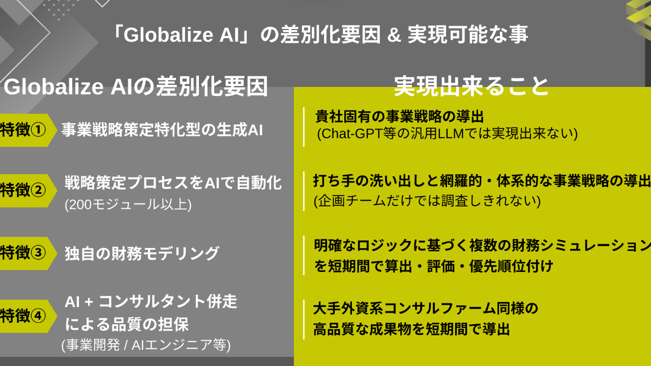 Globalize AIは経営者・新規事業企画・経営企画・投資部門・アライアンスなどの「戦略企画」に関わる皆さん向けのプロダクトです。