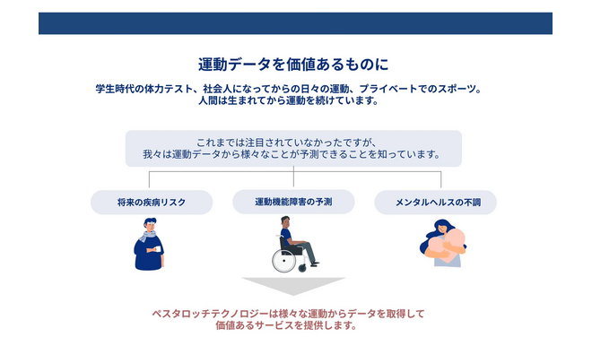 学生時代の体力テスト、社会人になってからの日々の運動、プライベートでのスポーツ。人間は生まれてから運動を続けています。そして、これまでは注目されてきませんでしたが、我々は運動データから様々なことが予測できることを知っています。 ペスタロッチテクノロジーは、教育現場をはじめ様々なシーンの運動データを取得し未来につなぐ、価値あるサービスを提供します。