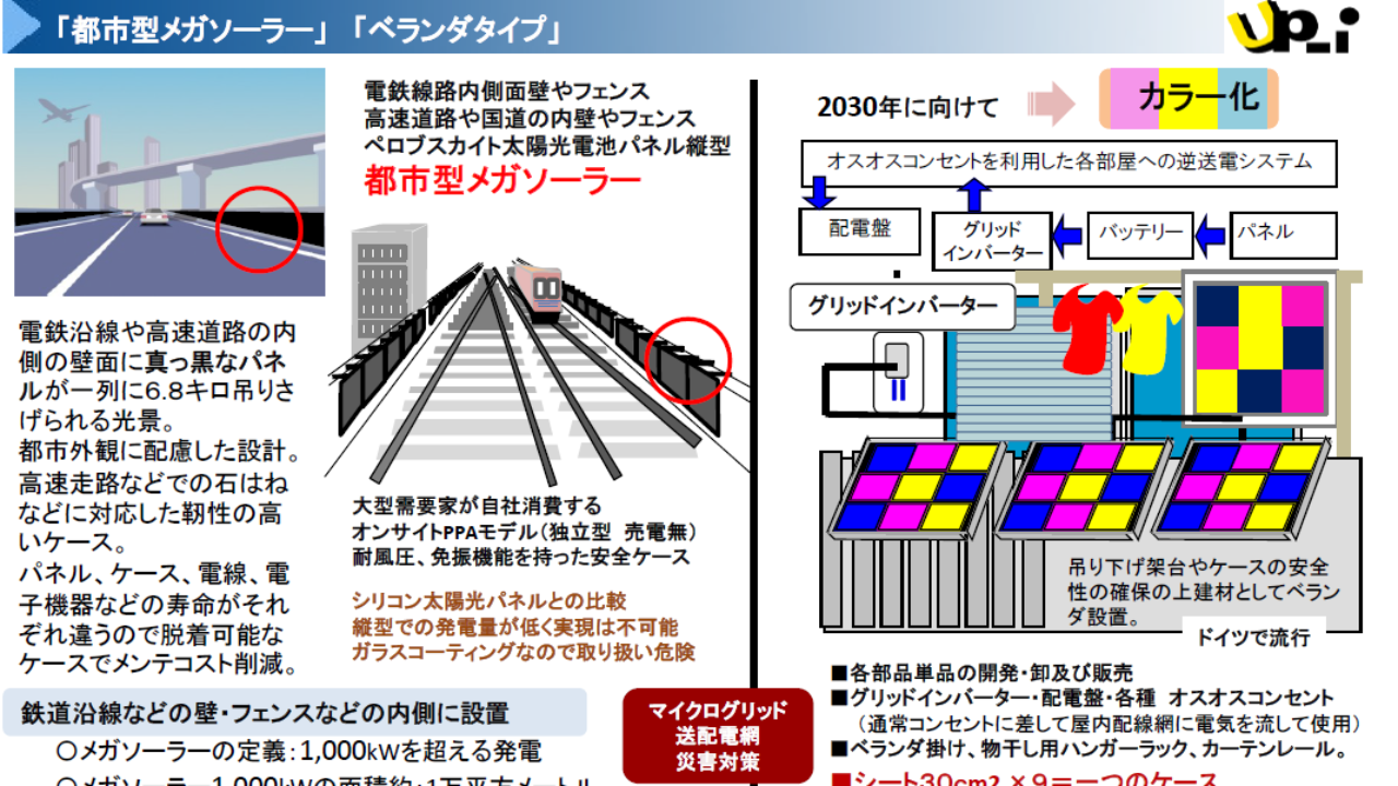 B)鉄道・高速道路の内壁に安全な内壁縦型設置による大需要家事業者向けオンサイト独立型)。災害に強い都市型メガソーラーを実現する免振機能を取り入れたケースの開発。