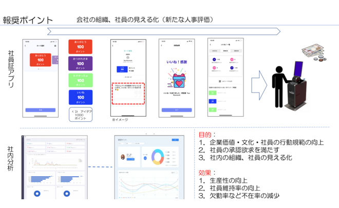 社内の日常において、「感謝」の気持ちを社員間で簡単に伝えることで、エンゲージメントの向上を図ります。従業員の活力向上や生産性の向上等の組織の活性化をもたらし、結果的に業績向上や株価向上につながると期待できます。「感謝ポイント」の原資は福利厚生費で運営できます。溜まったポイントは、セルフレジを通して現金化できます。現金化の申請等、人の手を介さずに処理できるのが好評です。