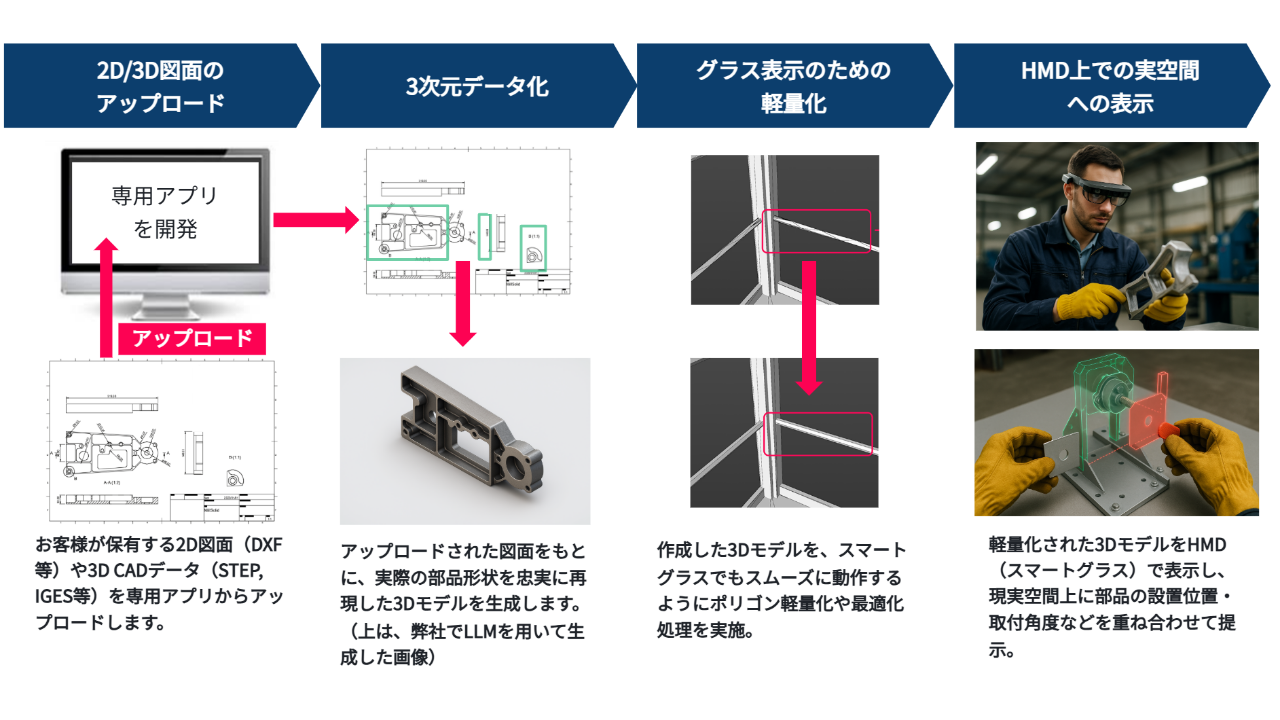 具体的には、現場作業のAI画像認識による自動記録、XRスマートグラスを活用した作業指示・技能継承支援、3Dスキャンによる空間データの自動取得・分析など、「入力→分析・可視化→活用」のモジュール構成で、現場ごとに異なる課題に柔軟に対応。要件定義からAIモデル開発、アプリ・システム構築まで一気通貫で開発可能です。