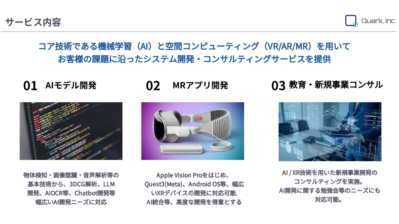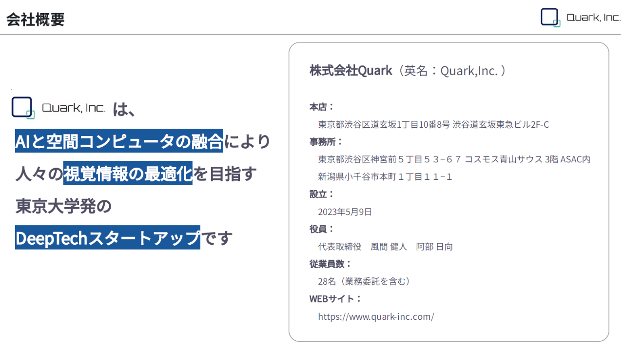 株式会社Quarkは、東京大学発のAI×XR DeepTechスタートアップです。3D Gaussian Splatting(3DGS)、LiDAR、コンピュータビジョン、XR/スマートグラスを統合した空間コンピューティング技術により、製造・建設・インフラ領域の現場DXを実現します。