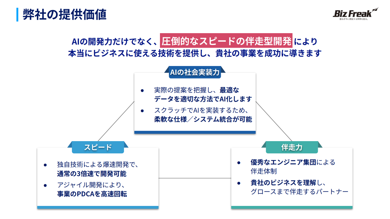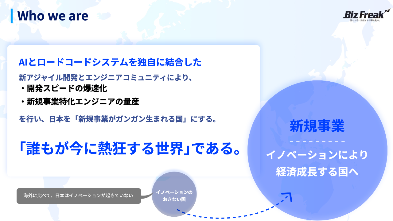 BizFreakは、AIとロードコードシステムを独自に結合し、新アジャイル開発とエンジニアコミュニティを通じて、開発スピードを加速化、新規事業特化エンジニアを量産することで、日本を「新規事業がガンガン生まれる国」にすることを目指します。現状、海外に比べて日本のイノベーションは遅れていますが、BizFreakはイノベーションを起こし、経済成長へと繋げることで「誰もが今に熱狂する世界」を実現します。現状を打破し、日本をイノベーション大国へ、そして経済成長する国・企業へと変革していくことがBizFreakの目標です。