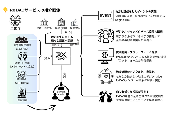 RX DAOは、一般社団法人が運営する次世代型WEB3プラットフォームです。地域自治体、企業、学生、クリエイターなど、さまざまなステークホルダーが集まり、地方の課題解決や新たな価値創出に向けたプロジェクトを展開します。