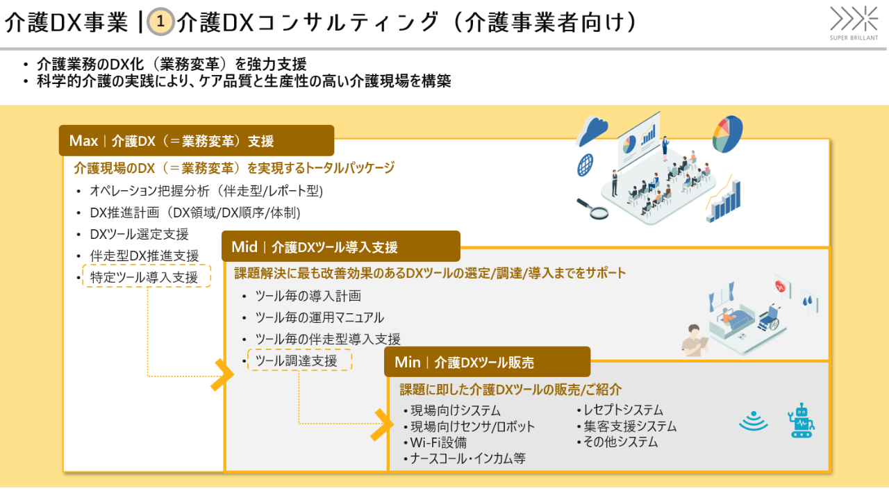 ・介護業務の課題抽出からその解決までを主にはDXを取り入れた問題解決手法にて伴走支援していきます。