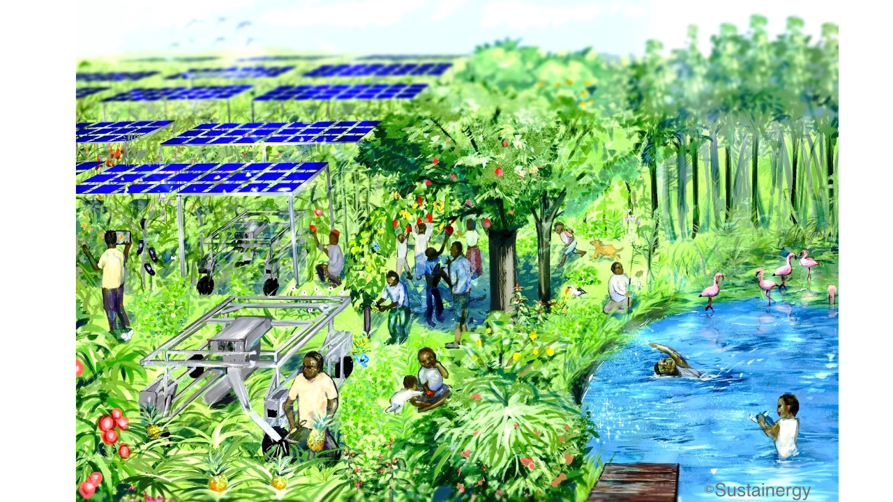 太陽光発電、農業ロボット、シネコカルチャー (SynecocultureTM、協生農法®︎ )で劣化した土地の生物多様性を回復し、エネルギー不足、食料不足を解決することで気候変動問題解決とカーボンニュートラルに貢献する。電気、栽培作物、CO2削減価値を販売する。電気はロボットの電源、周辺地域の電源となる他、栽培作物の貯蔵、加工、運搬にも利用することで作物の付加価値を上げる。ロボットにはセンシングAIシステムとマルチタスクツールを搭載し、人の生態系リテラシー向上と農作業実施の両方をサポートし、人と生態系、人とロボットが協生する。