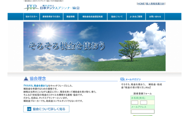 『そろそろ、税金を使おう』をキャッチフレーズとした、 補助金を申請するための資格です。 納税は当然のことながら適正に行い、理念を持って補助金を受け取り、使う。 そんな21世紀型の税金のスタイルを標榜する資格・協会です。 だから、名前は、タックスプランナーといいます。 補助金ブローカーでも、助成金コンサルタントでもないのです。