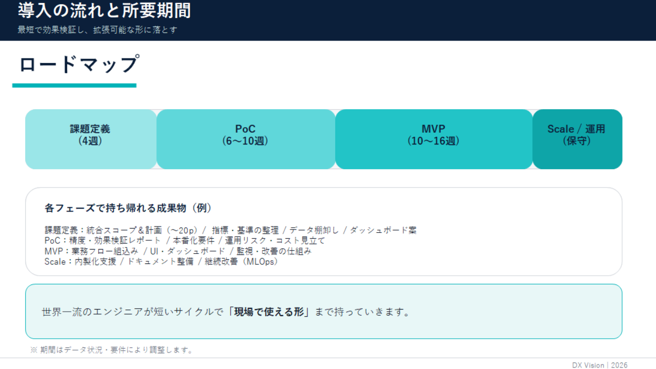 フェーズごとに、課題定義(指標・基準/データ棚卸し/ダッシュボード案)、PoCレポート(本番化要件・運用リスク見立て)、MVP(業務フロー組込み/監視・改善の仕組み)、Scale(内製化支援/ドキュメント整備/継続改善)を成果物として残します。