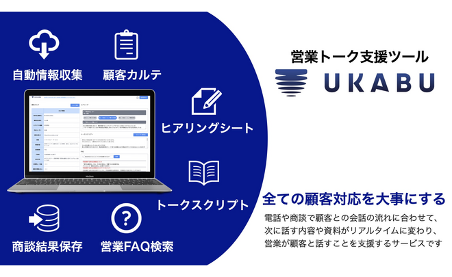 電話や商談で顧客との会話の流れに合わせて、 次に話す内容や資料がリアルタイムに変わり、 営業やコミュニケーターが顧客と話すことを支援するサービスです。覚えていなくても、思い出せなくても、UKABUを見ながら顧客と話す世界へ。スクリプトやFAQなどのトークナレッジの作成や、追加・修正・更新もノーコードで簡単にでき、AIによる作成支援もできるシステムです。