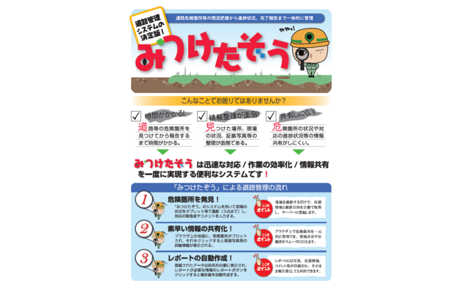 道路管理の革新的システム「みつけたぞう」は、道路の危険箇所等の現況把握から追跡状況、完了報告まで一体的に管理する便利なシステムです。