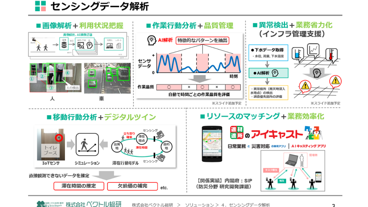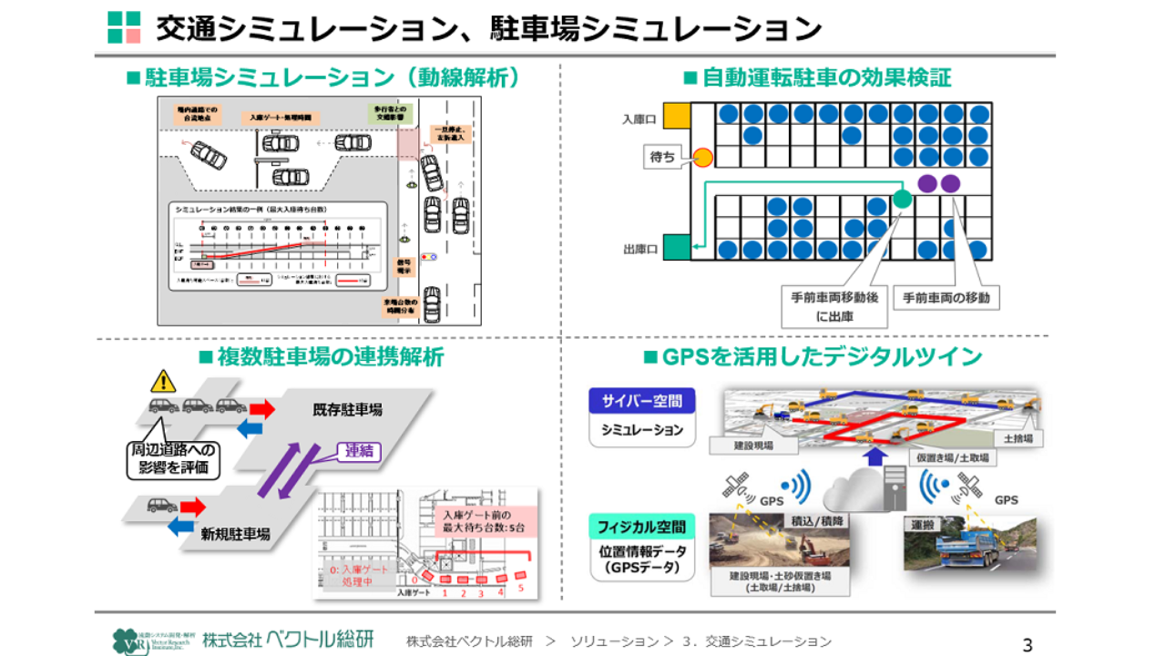 当社のシミュレーション開発・解析技術は、利用者と運用者に関する経験則や蓄積された行動ルールのデータベース、屋内位置測位システム、行動シミュレーション、社内協業AI学習機能を統合した汎用型「顧客・施設運用ITマニュアル」の展開事業である。このITマニュアルは、日常の顧客対応や施設・設備管理の点検・教育業務における効率的・持続的メンテナンスを実現するエキスパートシステムとして、多様な施設・業種へのシステム普及やコンサルティング事業を展開し、効率化され続ける業務を未来へ承継する。