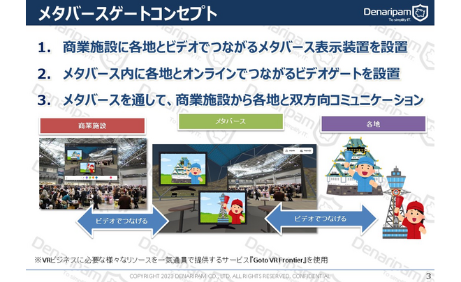 メタバースゲートは、クラウドから提供されるオンラインサービスで、ブラウザで動作します。VR用ヘッドセットがなくても、一般的なノートPCやWebカメラを接続したPCやスマートフォンで動作し、現地を含めどこからでもメタバース参加も可能です。5Gモバイルルータと組み合わせると、固定のネットワーク設備無しで利用可能です。