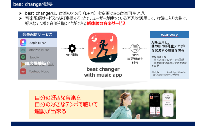 beat changerは、ユーザーの歩行や運動テンポに合わせて、音楽の再生速度(BPM)を調整できる音楽サービスです。Apple Musicなどの音楽配信サービスと連携し、ユーザーが普段聴いているお気に入りの楽曲を「その時の自分のリズム」にぴったり合うテンポで再生できるのが特徴です。