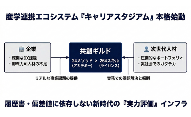 Z世代(U18〜大学生)の圧倒的な熱量と「実践的な事業開発メソッド」を掛け合わせ、企業の新規事業開発や次世代リーダー育成に実務レベルで伴走する産学連携エコシステム『キャリアスタジアム』。「24メソッド」と「264スキル」による「共創ギルド」で、企業のDXやAIの課題解決と次世代人材のポートフォリオ形成を直結。即戦力を求める企業と、実践機会を求める学生・教育機関を繋ぐ実学マッチングを提供。