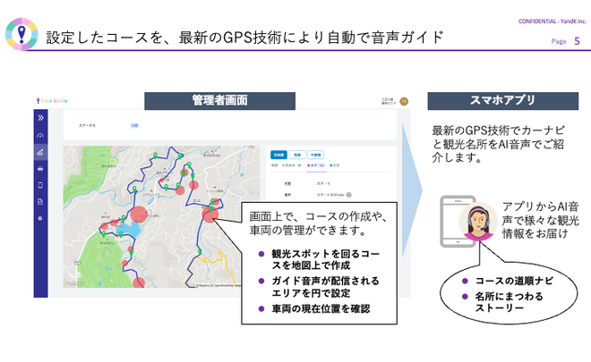 本システムは国交省のプロジェクトで開発し、各地の観光地や観光事業者様にてPoCや事業化に向けて動いています。エリア全体を周遊させるコース作成、インバウンド向けアクティビティ提供、観光コンテンツの掘り起こし、など、観光にたずさわる方々の課題解決に向けてご提案しています。
